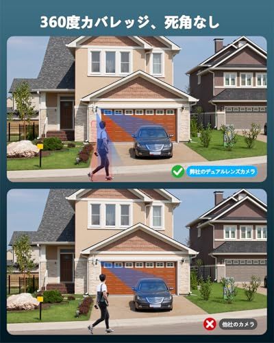 {デュアルレンズ & 両監視画面} 屋外防犯カメラのお悩み「片側しか映らない」「複数侵入者の死角突破」を解決!当製品は固定広角カメラ回転カメラを搭載しています。上の固定カメラは130広角で、監視範囲がより広いです。下部には355の水平回転と90の垂直回転が可能なPTZカメラを配置し、庭・玄関・駐車場を同時に360度監視します。従来の単眼カメラと比べて200%以上の視野角を実現し、1台で2台分の監視効果を発揮します。防犯カメラ 広角無死角に特化した設計で、空き巣の死角突入を完全防止します。