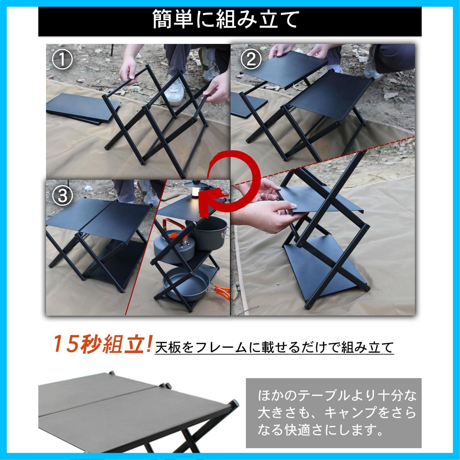 【組立ても簡単】フレームを広げて天板を乗せるだけで完成する簡単組み立てで、設営も撤収も簡単。 ソロキャンプに最適なコンパクト設計で、持ち運びに便利な収納バッグも付属しています。