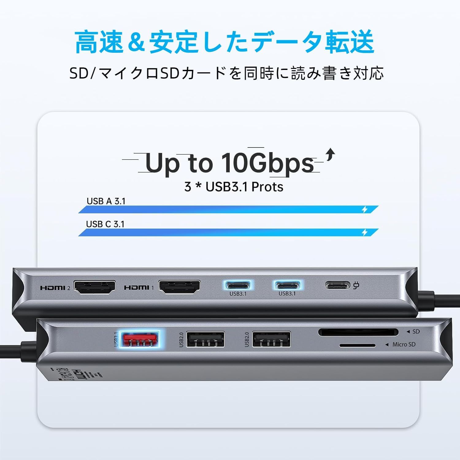 【内蔵 SD および TF ポート 10Gbps 速度高速同期データ & スピーカー/マイク接続用 3.5mm オーディオジャック】usb ドッキングステーションの中には2 つの USB C 3.1 ポートと 1 つの USB A3.1 ポートがドッキングステーションに内蔵されており、10Gbps 高速レートでのデータ転送と幅広いアプリケーションの同時使用が可能です。 また、ドッキングステーションには SD および TF スロットが内蔵されており、ユニバーサル SD および TF メモリーカードのファイルに簡単にアクセスできます。 写真やビデオをすばやく表示できるので、写真家、デザイナー、ビデオ編集者にも便利です。 また、オーディオポートを使ってスピーカー/マイクを接続することもできます。 この3.5 mmポートはオーディオとマイクの両方に対応しており、オンライン授業、勉強、会議、音楽鑑賞などを、他人に邪魔されることなく楽しむことができます。