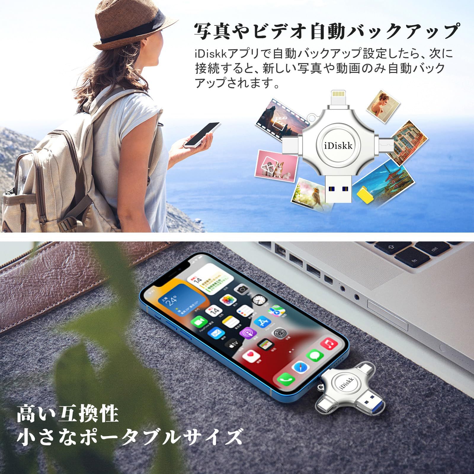 【写真の自動バックアップ・ワンクリックバックアップ】 フラッシュドライブ接続時に、ワンクリックで、IOSデバイス内の写真やビデオがバックアップ可能で、Appleデバイスのカメラロールを自動バックアップするようにiDiskkアプリで設定することができます。新しい写真・ビデオ・音楽・ドキュメントのみを自動的にバックアップされます。手動でバックアップする写真を選択する必要はありません。