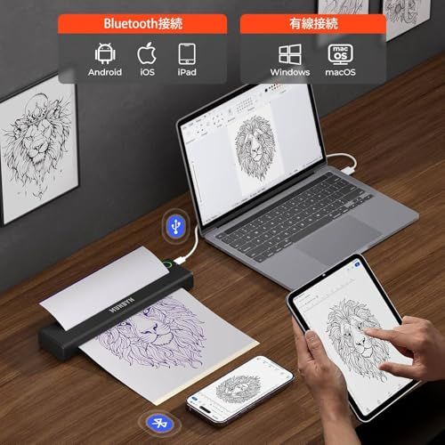 互換性: MUNBYN ITP05 タトゥープリンターは、AndroidおよびiOSのモバイルデバイス(電話およびタブレット)に対応しており、Bluetoothを介してシームレスに印刷できます。PCデバイスの場合、WindowsおよびmacOSに対応しており、有線接続が必要です。注意:PCデバイスの場合、このプリンターはBluetooth接続をサポートしていません。