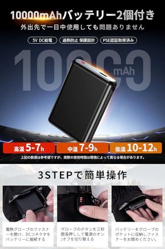 【3段階温度調節&最大約65の高温制御システム】DC加熱式ヒーターを採用し、低温(約4045)・中温(約5055)・高温(約6065)の3段階温度調節に対応。気温や用途に応じて最適な温度を自由に切り替え可能です。発熱時間は低温モードで約1012時間、中温で約79時間、高温で約57時間