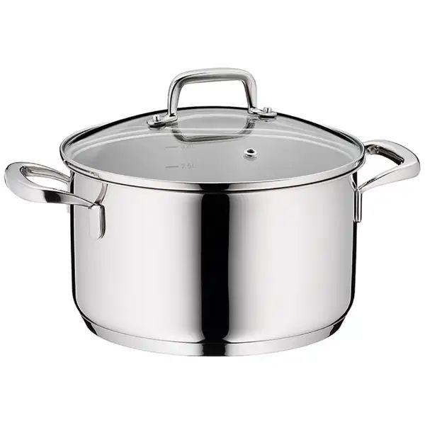 洗練された高品質のステンレス鍋。毎日の料理で使いやすいデザインです。お鍋の中身が見えるガラス蓋付き。「底厚の3層構造」ステンレス+アルミ+ステンレスの3層からなる底厚はムラなく効率よく熱を伝え、また保温性にも優れます。素材をじっくり、ふっくら調理可能。