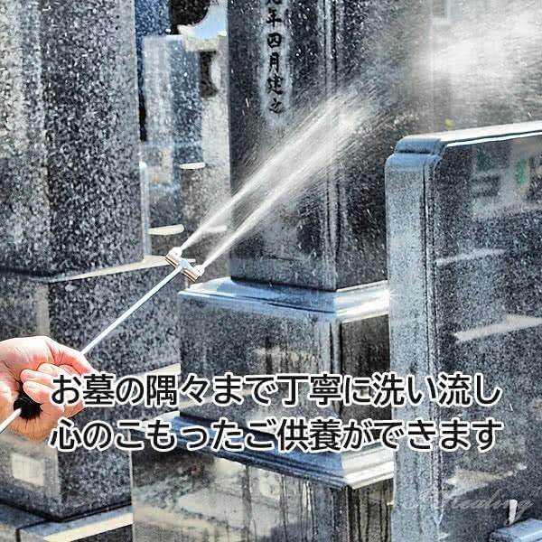 持ち手部分を伸縮させると内蔵ポンプが加圧され、水を引き上げて強力なジェット水流が飛びますので墓石や墓碑の刻みに溜まった、砂ぼこりや苔までキレイに洗い流せます。