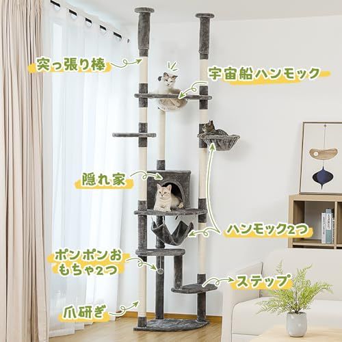 ぺテぺラ キャットタワー 突っ張り スリム ツッパリ 猫タワー 省スペース 透明 宇宙船ハンモック おもちゃ 麻紐 爪とぎ 運動不足解消 多頭飼い グレー 高さ調整幅236 258 cm 354 d 65 a 7