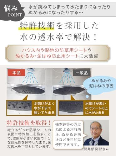 特許取得の防草シート 1974年創業メーカーの日本製 雑草の繁殖防止に!プロの農家さんが愛用する防草シート。 高耐久・高遮光率・高密度で耐久性に優れています。 独自の即効透水加工で、水はけ抜群。 20cm間隔で格子状にラインが入って作業効率大幅アップ!ピン止めや配置を決めるのにも便利。 ハサミでカットもしやすい。