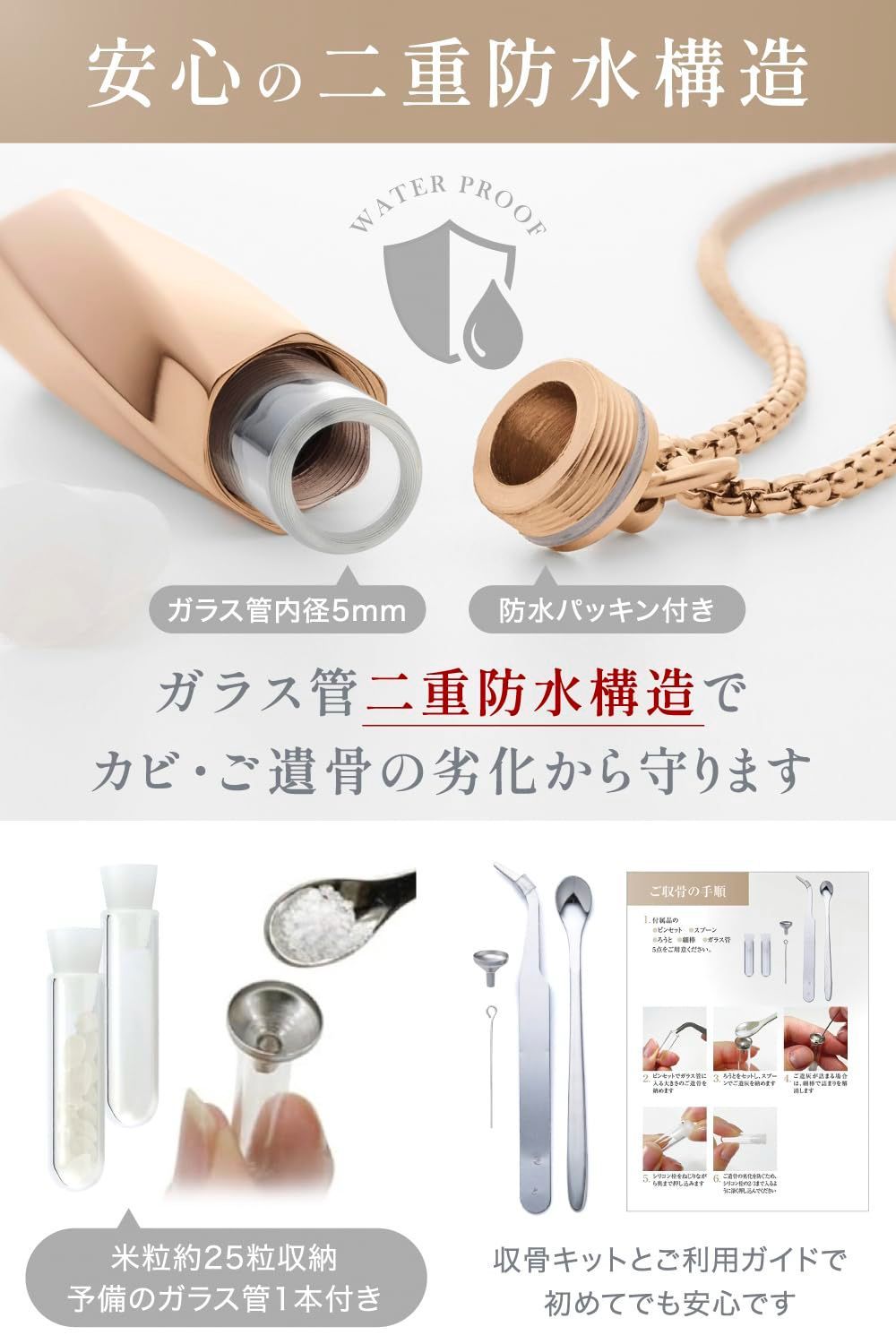 【ガラス管入り二重防水構造】 ペンダント内側にガラス管入りの「二重防水構造」。フタの裏側には「防水パッキン」が付いており、ご遺骨の劣化(カビ・腐敗・悪臭)を防ぎ末長く保存ことができます。