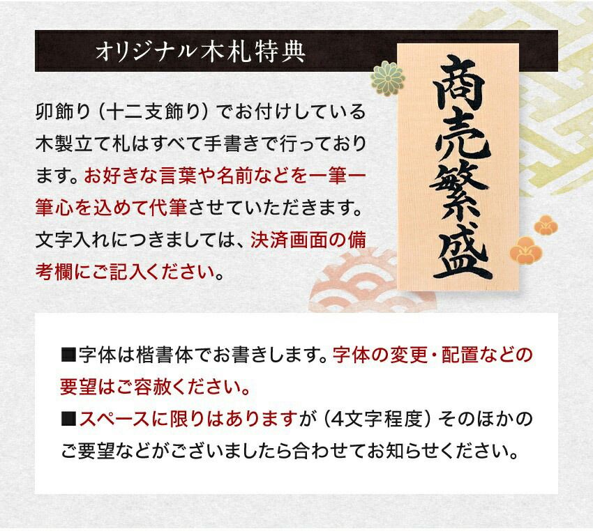 こちらの商品は無料手書き特典付きの木札が付いております。ご注文後、メールにて連絡させていただきますので、ご入用の際はご記入ください。返信がない場合は、木札はなしでお送りさせていただきます。