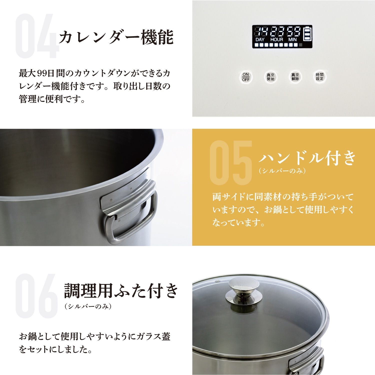 【便利な機能】カレンダー機能】最大99日間のカウントダウンができるカレンダー機能付きです。取り出し日数の管理に便利です。・どんなスペースにもコンパクトに収納】積み重ねて保存もできる。インテリアにも馴染むシンプルなデザイン