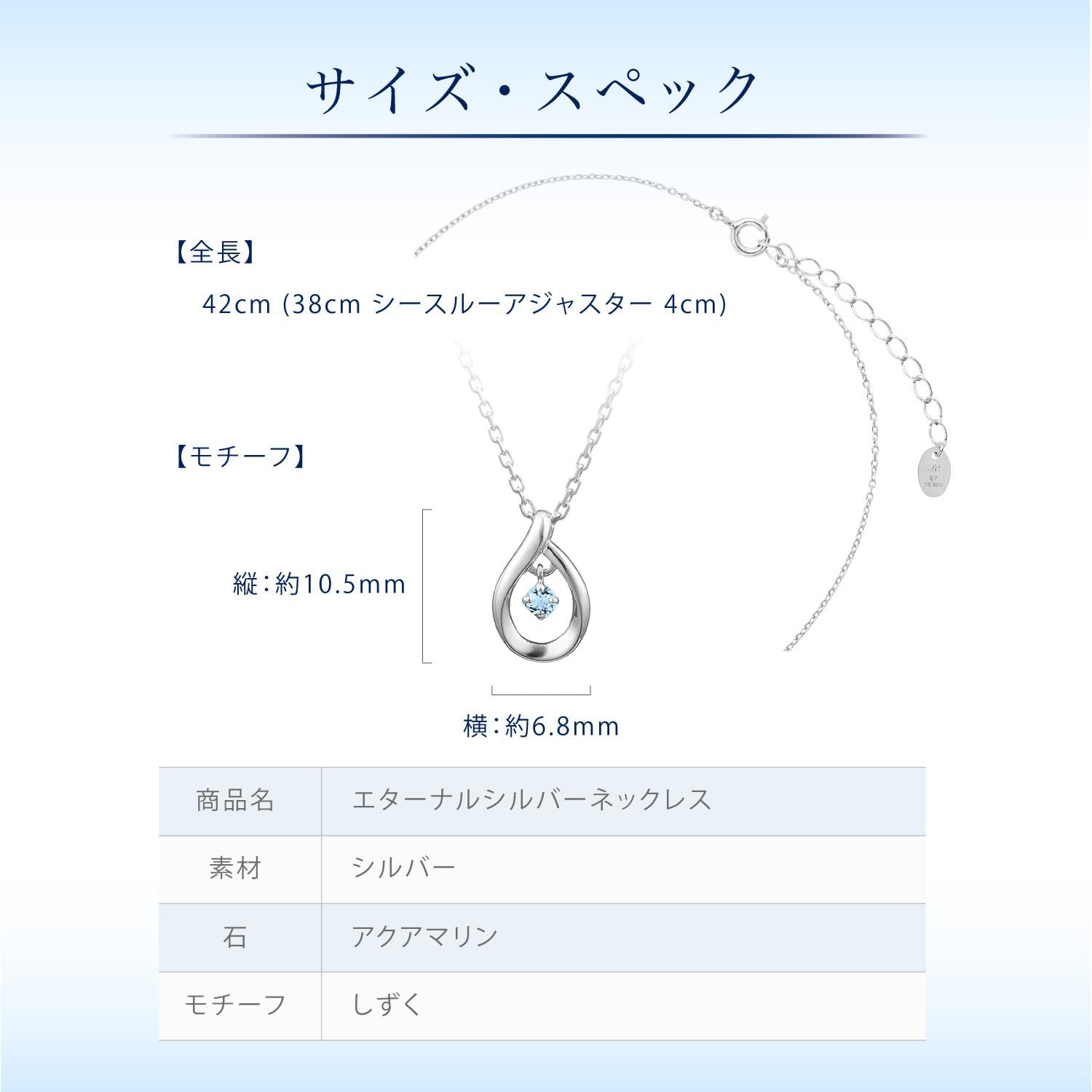 変色しにくいオリジナル素材「エターナルシルバー」を使用し、流れるようなしずくのモチーフがみずみずしく輝くネックレス。中央のアクアマリンが軽やかに揺れるたび、華やかな印象を与えます。純粋な心と癒しをもたらすといわれる3月の誕生石のアクアマリンが胸元を華やかに彩ります。※天然石を使用しているため、実際の色味や風合いが異なる場合がございます。
