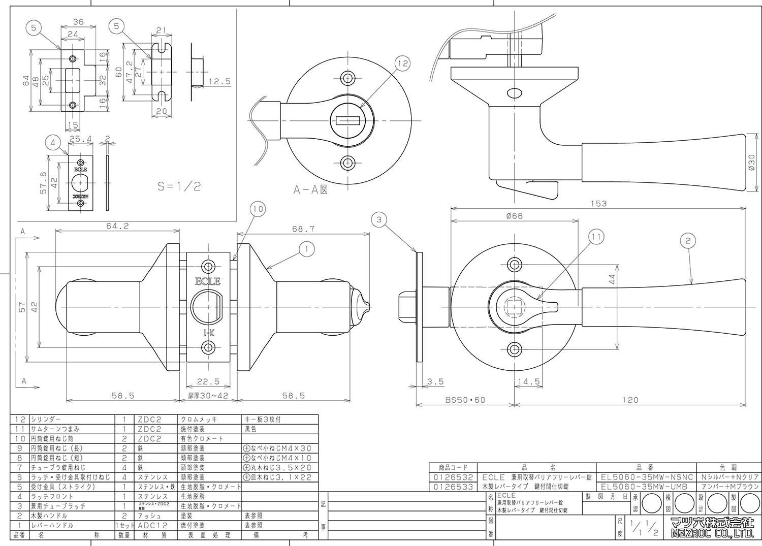マツ六 Mazroc レバー錠 エクレ 兼用取替バリアフリーレバー錠 鍵付間仕切錠 EL 5060 35 MW NSNC Nシルバー Nクリア 木製レバー