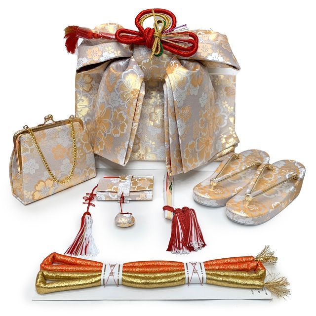 上品でモダンな柄の7歳女の子用の四つ身の着物に結び帯、はこせこセット、着付けに必要な小物を揃えたフルセットです。