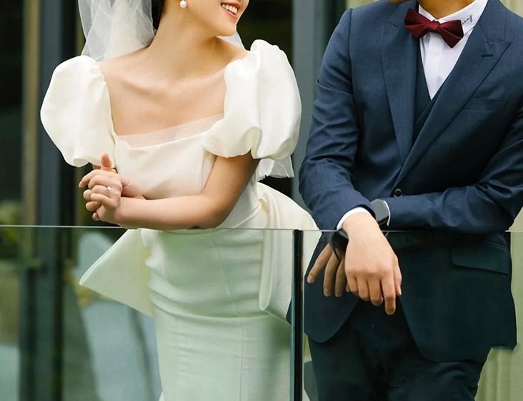 ロング マーメイド ウェディングドレス パフ袖 フリル サテン