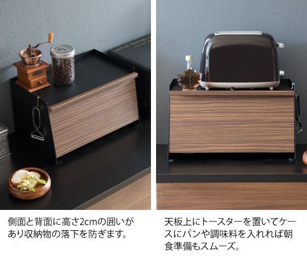 キッチンで雑多に置きがちなパンや調味料などをまとめて収納できます。前扉で中身を隠せて、必要な時はサッと開いて中が見やすく便利です。天板にはオーブントースターやコーヒーメーカーも置けるのでキッチン周りがスッキリ片付きます。
