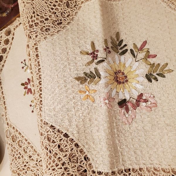 エストニア輸入。リボンの花柄刺繍がとっても可愛いテーブルクロスが登場です!エストニアの首都、タリンのマーケットより直接買い付けてきた商品です。ナチュラルで優しいな色合いが魅力的です。