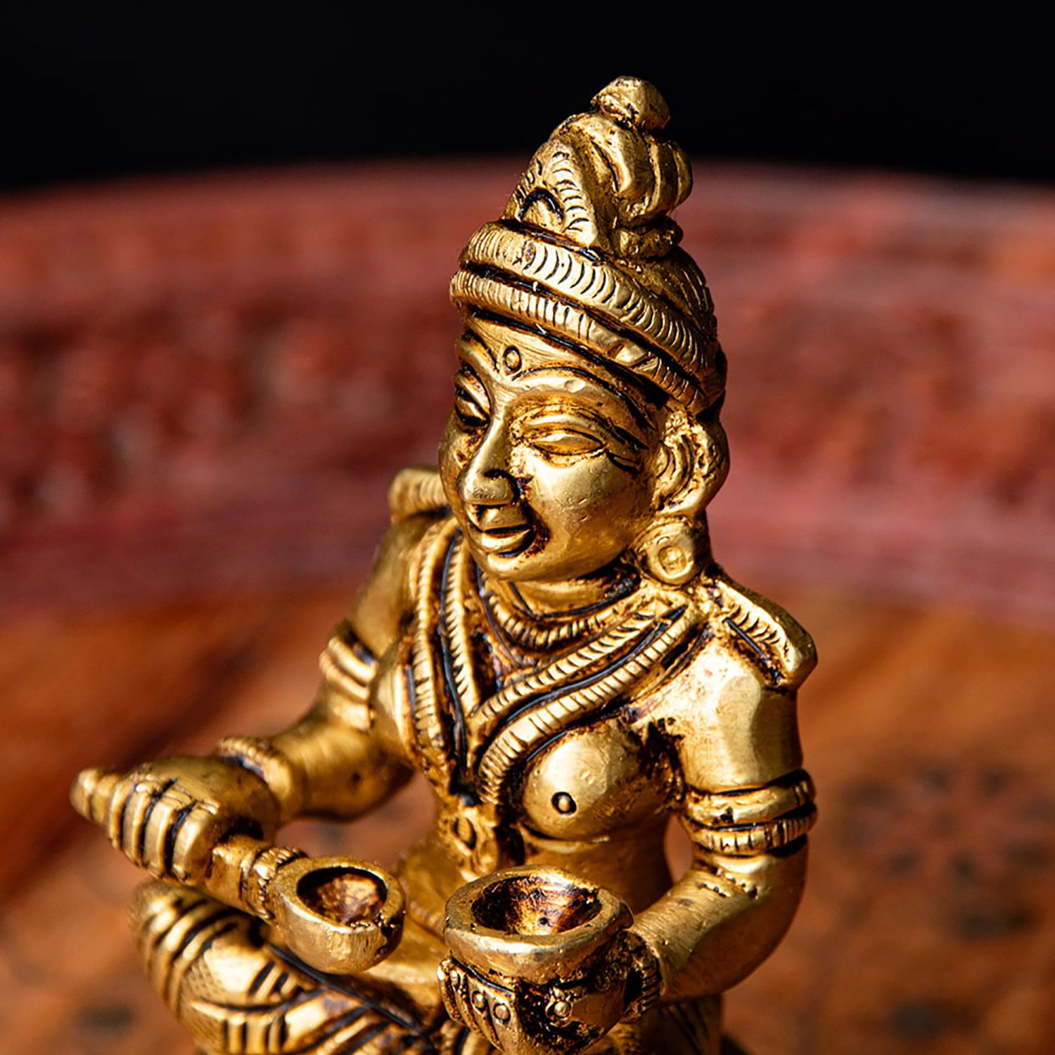 料理の神聖さを示すように、手におたまや器を持ち、食物を分け与える姿で表されます。祈りの場や台所に安置することで、家族の食卓が豊かになり、日々の糧への感謝の心を育むといわれています。