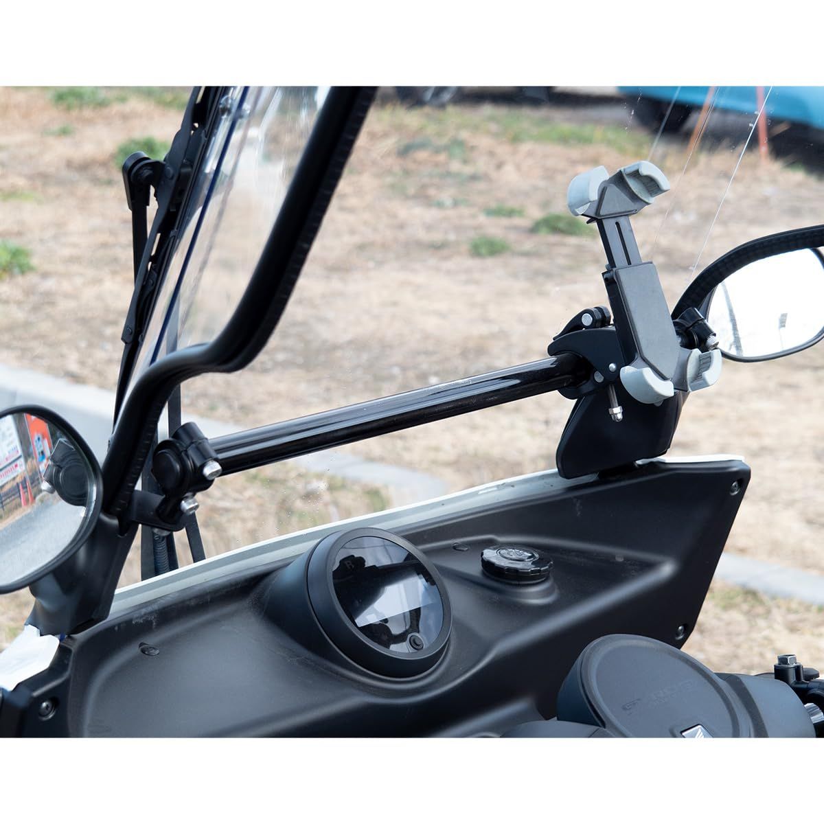 ジャイロキャノピーのメーター上にスマートフォン(ナビ)をはじめとする、各種電子機器を装着可能にするマウントバーです。取り付け部分のパイプ径は一般的なハンドルバーと同じφ22.2を採用しているため、汎用性が高く様々なアクセサリーに対応します。