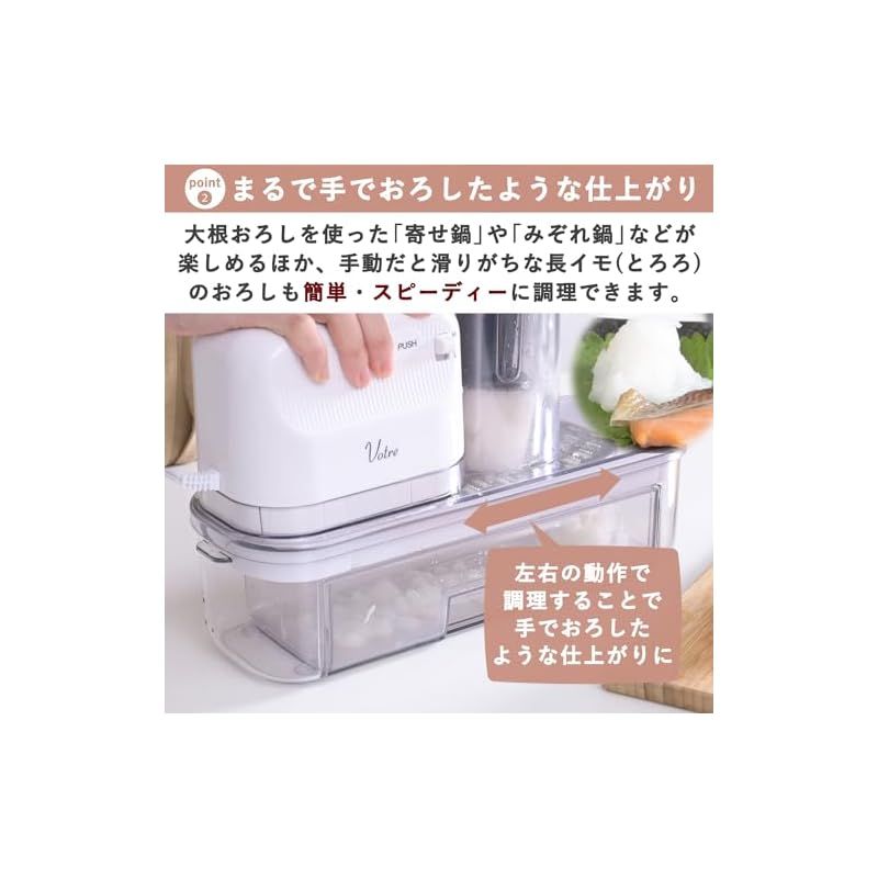 【美味しいおろしラクラク】「おろし」は、左右の動作で調理することで、手でおろしたような仕上がりとなり、これからのお鍋の季節に、大根おろしを使った「寄せ鍋」や「みぞれ鍋」などをお楽しみいただけます。また、手動だと滑りがちな長イモ(とろろ)のおろしも簡単・スピーディーに調理できます。