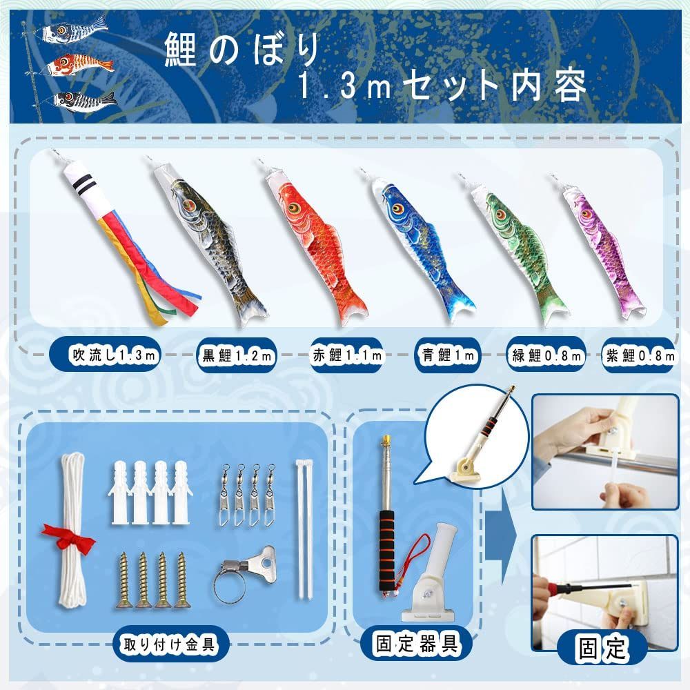 【ベランダ用鯉のぼり】簡単設置、ベランダに取り付けやすい固定器具付き。とても簡単、安全にベランダに取り付けられます。本製品が付属の説明書に加え。ベランダで泳ぐ鯉のぼりのように、きれいな景色が表しています!