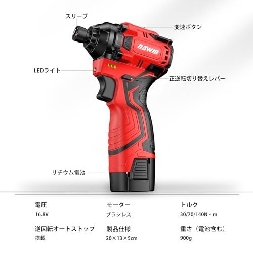 NAWIN ナウィン インパクトドライバー 16 8 V 最大トルク140 N?m 3モード 高回転 電動インパクトドライバー ブラシレスモーター 無段変速 充電式 DIY 日曜大工 家具の組立て LEDライト付 2 0 Ahバッテリー2つ f 06 ba 93 c
