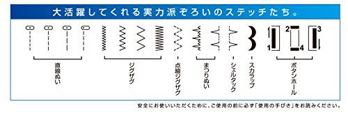 付属品:フットコントローラー、ジグザグ押え、ファスナー押え、ボタンホール押え、ボタン付け押え、ドライバー、リッパー/ブラシ、針パック、ボビン、シームガイド、糸こま押え(大小)、補助糸立棒、糸コマ座、使用のてびき、ソフトカバー