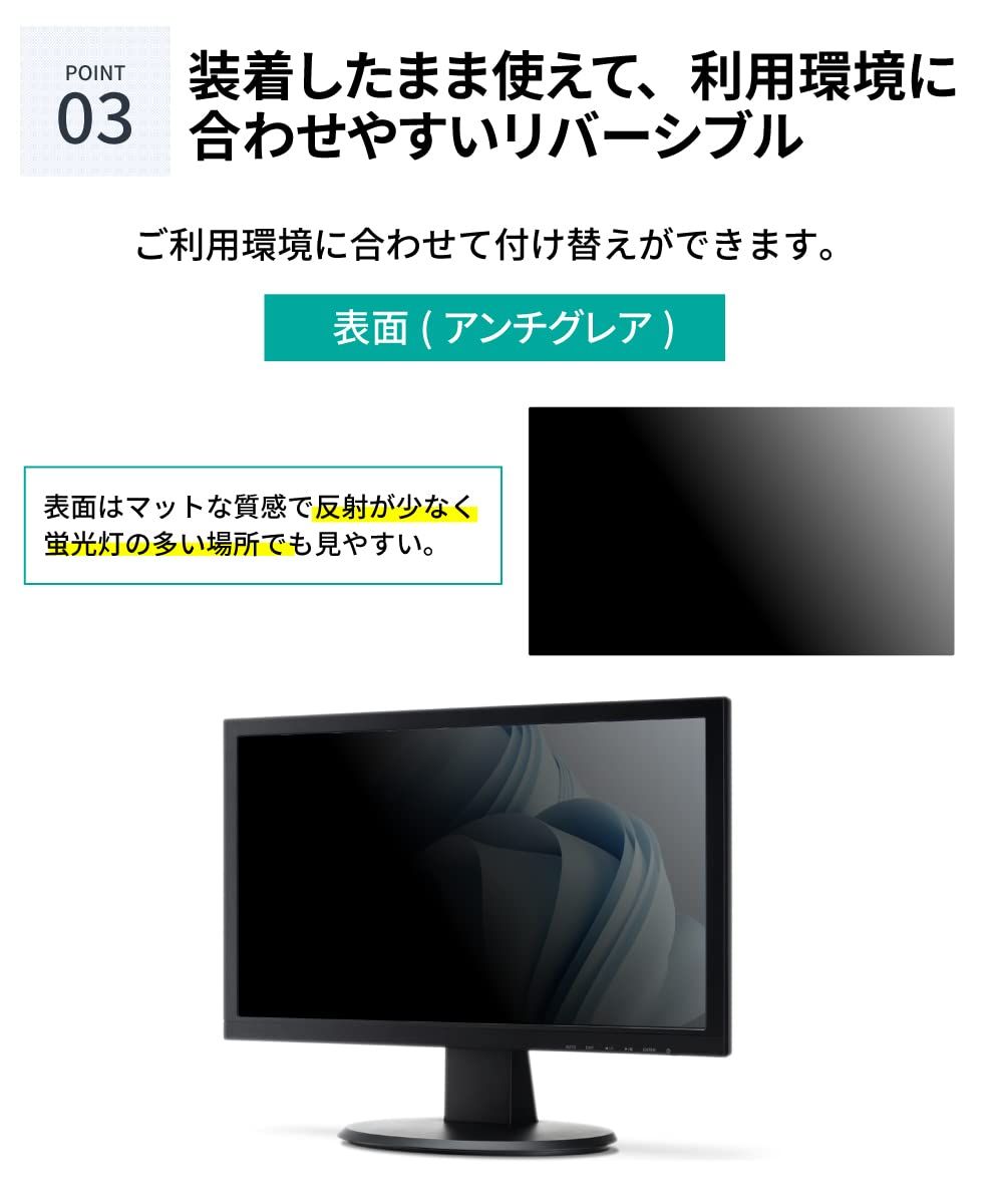 [ リバーシブル ] 表面はマットな質感で反射が少なく蛍光灯の多い場所でも見やすいアンチグレア面(反射防止加工・非光沢)、 裏面は反射率が高くサイドからの覗き見防止効果が大きいグレア面(光沢)です。ご利用環境に合わせて覗き見防止フィルターをご利用いただくことができます。