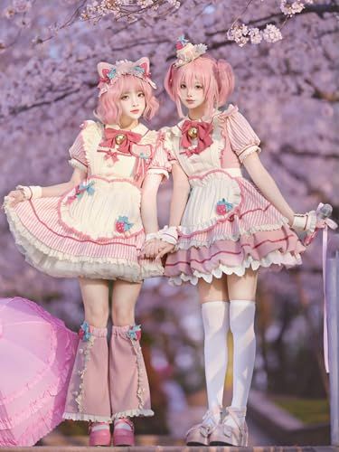 XHSUKADO メイド服 2点セット ワンピース レディース セットアップ ストライプ ロリータ エプロン 服 制服 ゴスロリ ドレス 洋服 フリル リボン メード服 コスプレ 仮装 Lolita アイドル 衣装 女の子 半袖 春 夏 1 bfb 73 ff