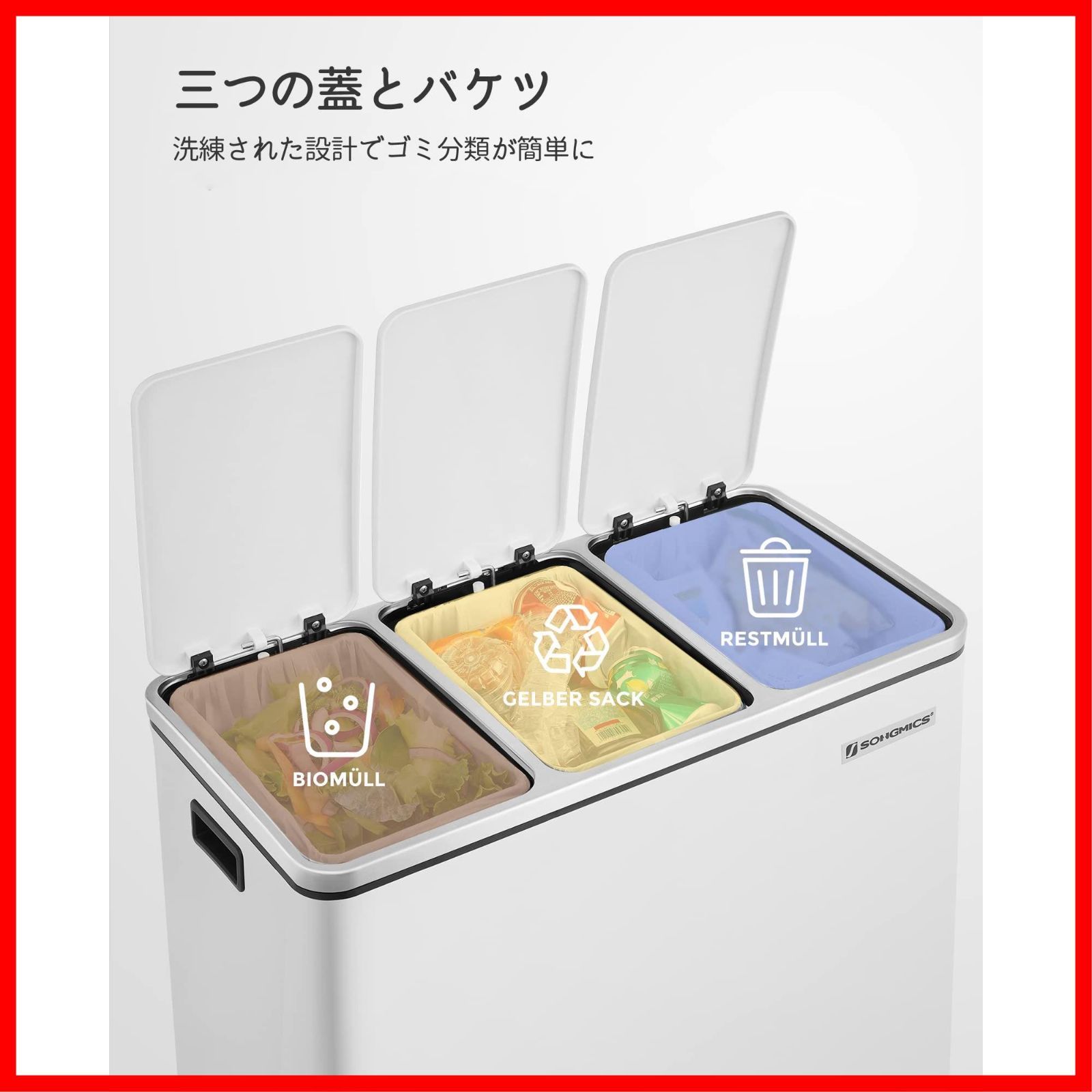 【万全なフォロー体制】SONGMICSは製品の品質確保、より良いサービスをご提供できるよう社員一同懸命に努めてまいります。商品に関するご質問等がございましたら、ご遠慮なく出品者名(Songmics JP)をクリックして弊店までご連絡下さい。サイズ 外箱:幅61.5cm(持ち手を含め、幅約62.5cm)×奥行31.5cm(ペダルを含まない)×高さ56cm;内箱:幅18cm×奥行26.5cm×高さ49cm;