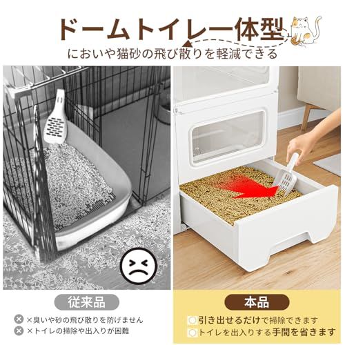 【トイレ付きの猫 ケージ】猫ケージとトイレを一体化にします。引き出し設計で、引き出すだけで排泄物を取り除き、ケージを開けずに掃除でき、面倒なトイレの掃除は簡単になりました。猫ちゃんが快適に過ごせます。