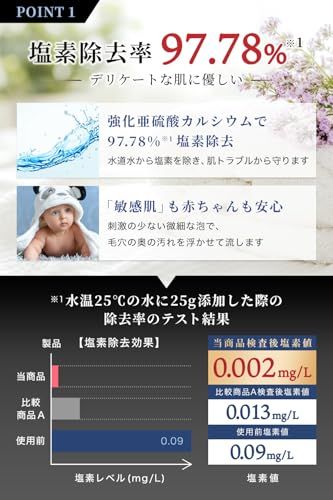 繊維フィルターで汚れを除去し、亜硫酸カルシウムで塩素を低減します。 亜硫酸カルシウムはより効率よく塩素を除去する為により性能が強化されたものを使用しています。(弊社従来品比)