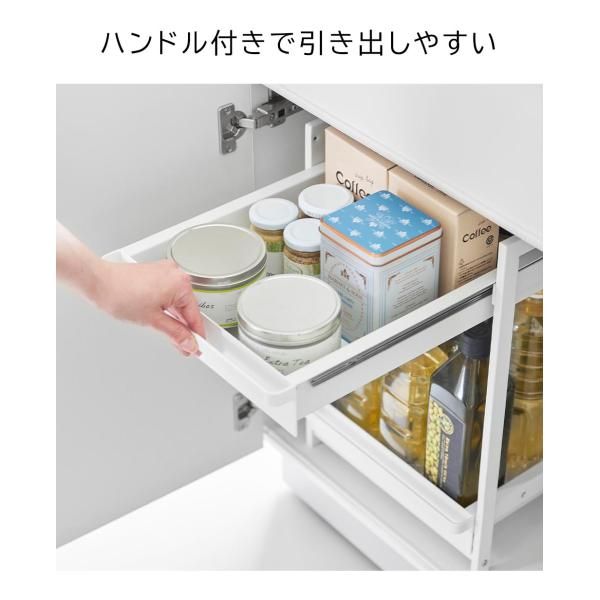 奥行と高さがあって収納が難しいシンク下を有効活用できるスライド式収納ラック2段。引き出しはハンドル付きで引き出しやすく、スライド式なので奥の収納物もスムーズに出し入れができます。引き出し上段は収納する物に合わせて、5cm刻みで高さが4段階調節できます。洗面台下への設置もおすすめです。
