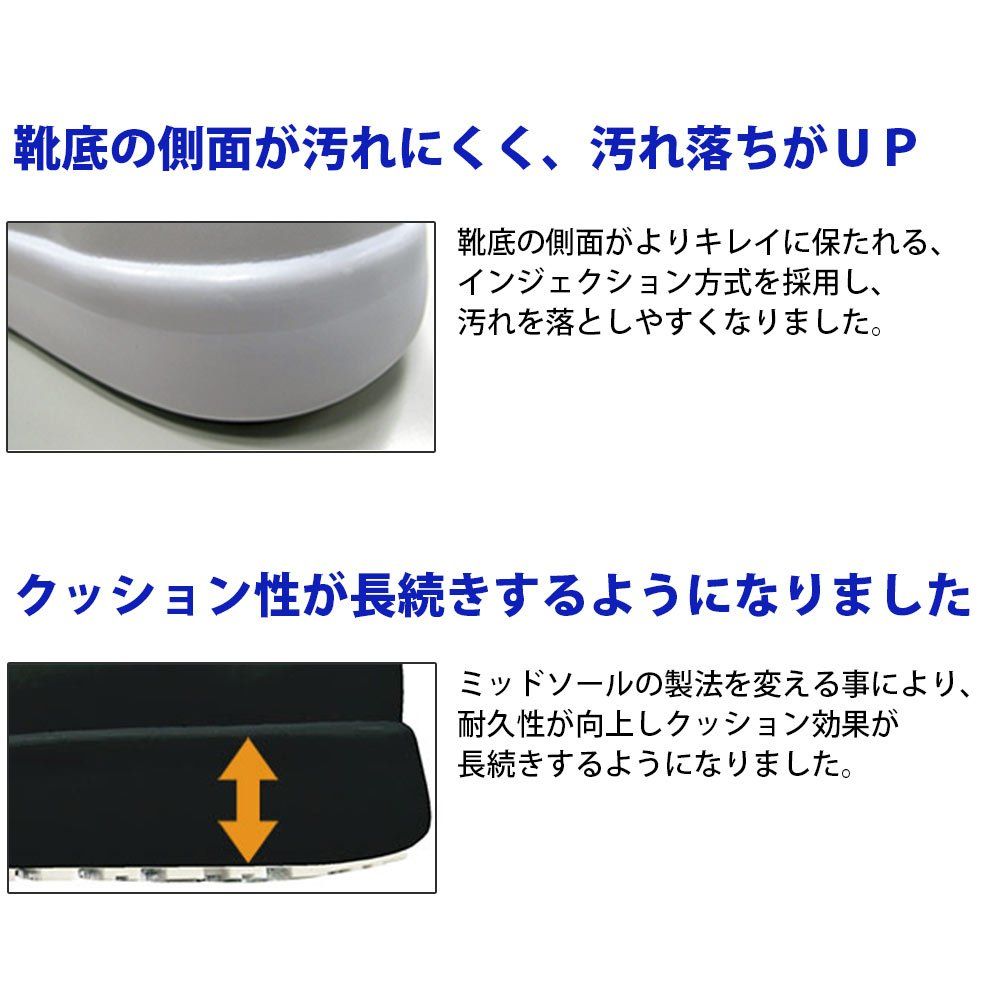 先芯:なし、甲被:人工皮革/合成皮革(ブラック・ホワイト)人工皮革(ブルー・ピンク・グリーン)、中敷:EVAインソール(抗菌・防臭)、靴底:EVA/合成ゴム[標準重量]