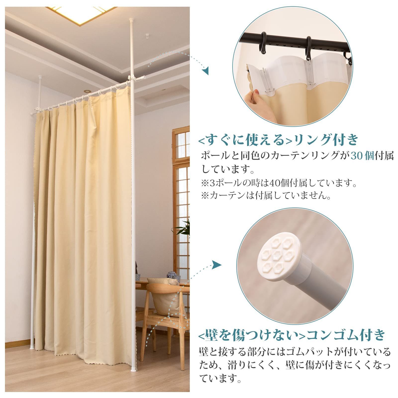 つっぱり式 間仕切り カーテンポール 部屋仕切り 間仕切りつっぱり棒 L字 コーナー 直線最大620cm パーテーション カーテンレール カーテンリング付 幅-高さ-奥行:110cm-310cm (マッドホワイト,3ポール)