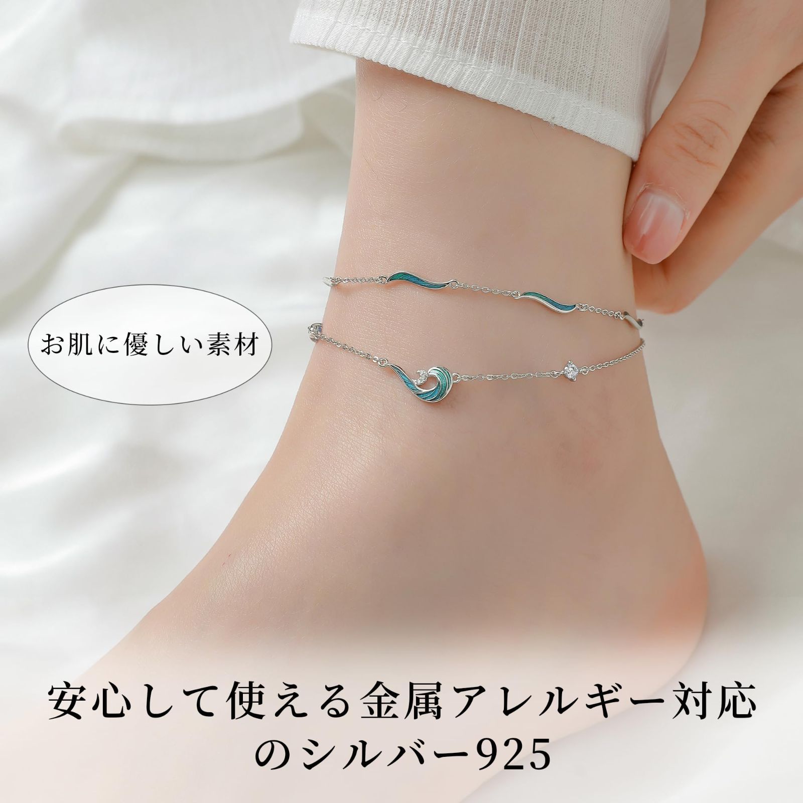 [シルバーサンダー] アンクレット レディース つけっぱなし人気 - シルバー 925 金属アレルギー対応 浪花モチーフ 海風デザイン ホワイトデー/誕生日プレゼント - アクアマリン/モアッサナイト