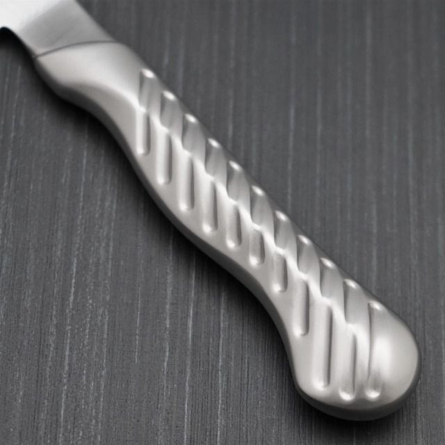 サーヴィス独特の握り方に対応した特殊形状ハンドルが、お客様の目の前で最高のパフォーマンスをサポートします。例えば、フルーツを切る際に流れる果汁を上手にコントロールできます。握りやすいトルネード模様は、見た目の美しさだけでなく、水や油のついた手で握っても滑りにくくさせます。中空のハンドルは刀身との重量バランスを考えサイズごとに板状の重りを内蔵しており、絶妙なコントロールを可能にします。
