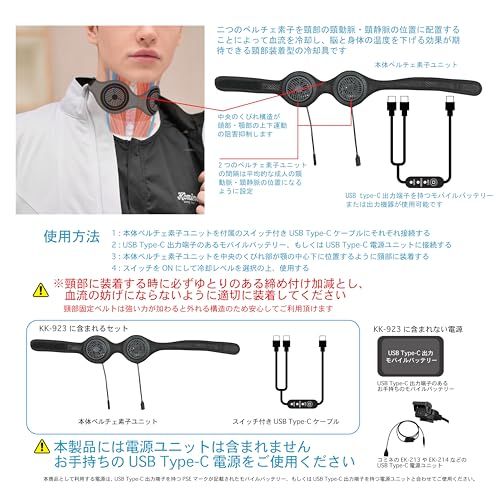 酷暑対策に、ペルチェ素子を頸部の頸動脈と頸静脈の位置に配置することで、血流を冷却し、体温を効果的に下げることが期待できる頸部装着型の冷却具。 ・電源は別途ご用意ください(USB Type-C出力端子のあるモバイルバッテリー) ※本製品は医療機器ではなく、快適性向上や熱中症リスク軽減を目的とした一般向け冷却用品です。 ※使用環境や体質によって効果は異なる場合があります。 ※脳を直接冷却するわけではなく、頸部の血流を冷却することで体感温度の上昇を抑えることを目的としています。