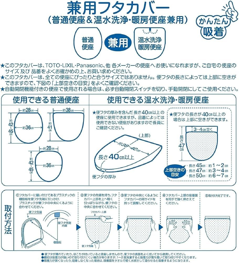 マルチタイプふたカバー 吸着シート付き 普通用・洗浄用兼用タイプ(画像内にある適合説明を確認ください) で、洗浄暖房型、普通型兼用でお使い頂ける、吸着シート付きのふたカバーです。 ※一部、ご使用になれない品番の便器がございますので、サイズ・適合表をお確かめのうえお買い求めください 素材・材質:アクリル100%(抗菌防臭・吸水素材) 生産国:日本 洗濯の際は洗