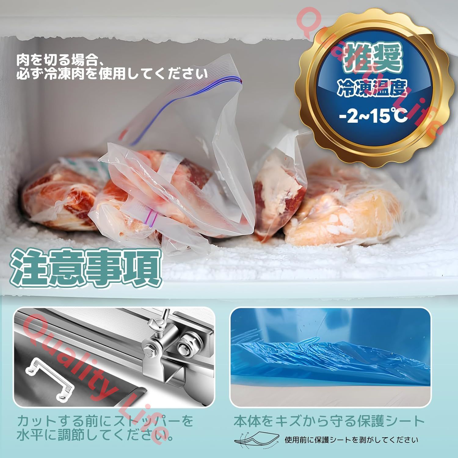 【注意事項】1.使用前に保護フィルムを剥がしてください。2.カットする前に調節用ストッパーを水平に調節してください。3.肉を切る時に解凍せず、冷凍のままにしておいてください。