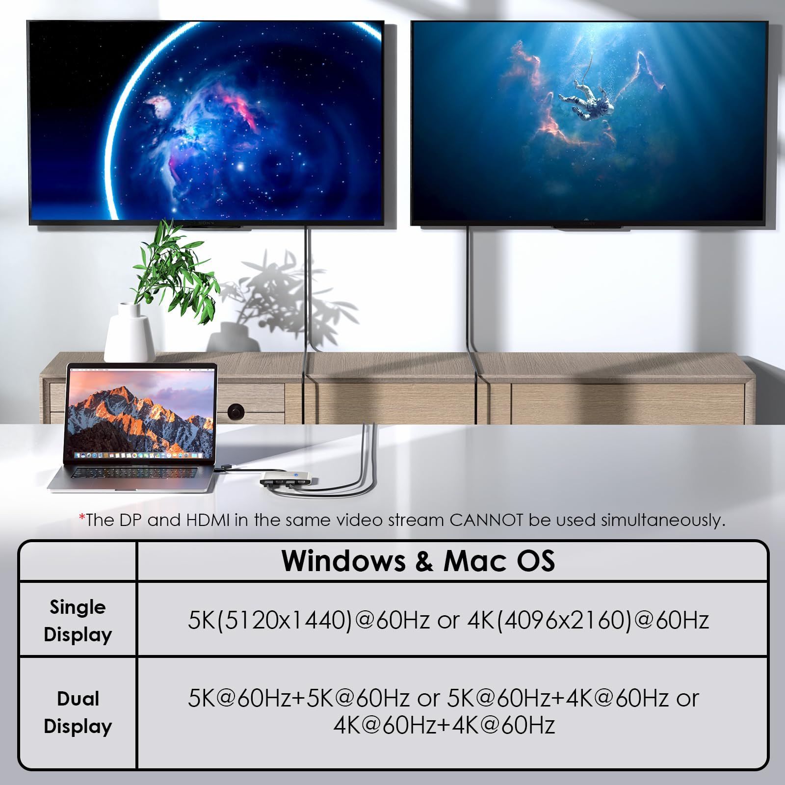 最大デュアル4K@60Hzディスプレイ:デュアルDisplayPortとHDMIポートを備えたこのアダプターは、ホストデバイスへのUSB3.0接続を1回行うだけで、デュアルモニター設定の利便性を体験できます 最大5120x1440@60Hzまたは4096x2160@60Hzのデュアル解像度をサポートし、両方のディスプレイで鮮明なビジュアルを楽しむことができます