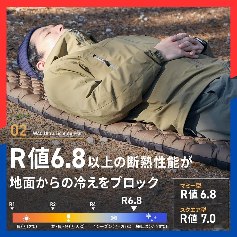 WAQ Ultra Light AirMat ウルトラライトエアマット アウトドア 7cm R値6.8 R値7.0 超軽量 コンパクト キャンプ 登山 簡単収納 エアバッグ付 リペアキット付 r値 マット 車中泊 テント泊 防水 防災 (スクエア-TAN(タン))