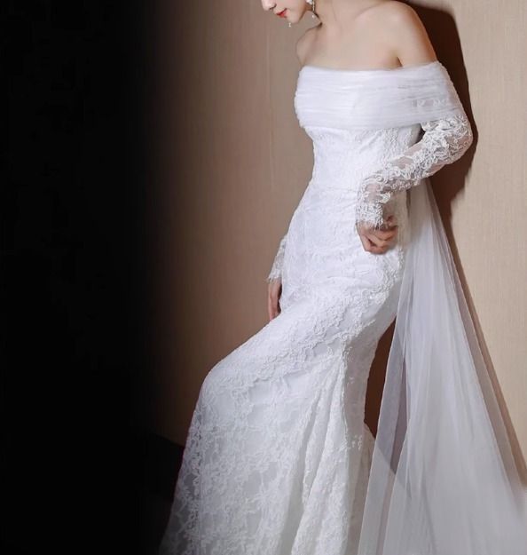 総レース ウェディングドレス 長袖 オフショル フィッシュテール