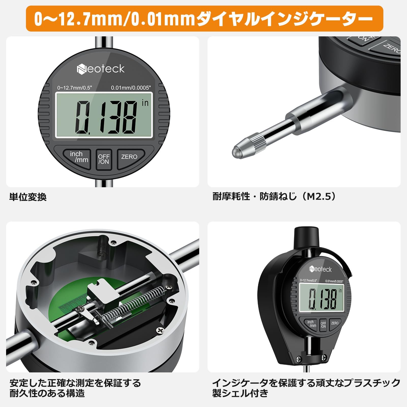 【デジタルインジケータ】デジタルインジケータ測定範囲: 0~12.7MM、分解能:0.01MM。測定前に、必ずダイヤルインジケーターを「0」設定に調整し、測定に適したサイズの測定ヘッドを選択してください。