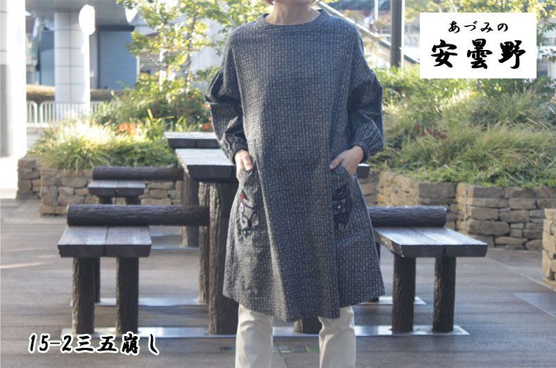 051204 15 2 三五崩し Cherry Pollen 安曇野 大きい 婦人服 F 11号~13号相当 ゆったり 藍染め風和柄 おしゃれ割烹着 久留米絣パッチワーク ホームウエア