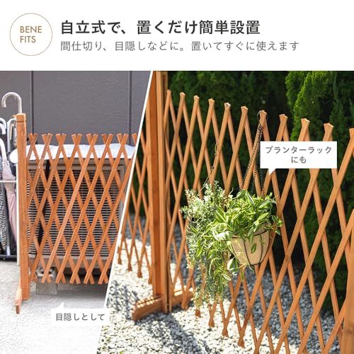 【アコーディオンのように伸ばして広げるフェンス】 温かみのある天然杉材と落ち着いたブラウンカラーが、お部屋やガーデンをアンティーク調に演出します。プランターラックとしても使える設計で、お気に入りの花や小物を飾って、おしゃれな垣根として活用できます。