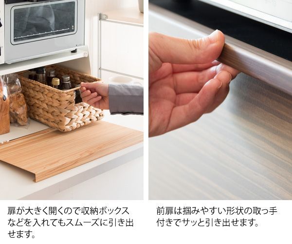 キッチンで雑多に置きがちなパンや調味料などをまとめて収納できます。前扉で中身を隠せて、必要な時はサッと開いて中が見やすく便利です。天板にはオーブントースターやコーヒーメーカーも置けるのでキッチン周りがスッキリ片付きます。