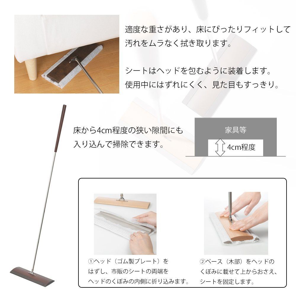 フロアワイプは、天然木を使用したスタイリッシュなフロアワイパーです。床にしっかりとフィットし、狭いところのホコリもきれいに拭き取ります。インテリア、フローリングになじむ美しいデザインです。