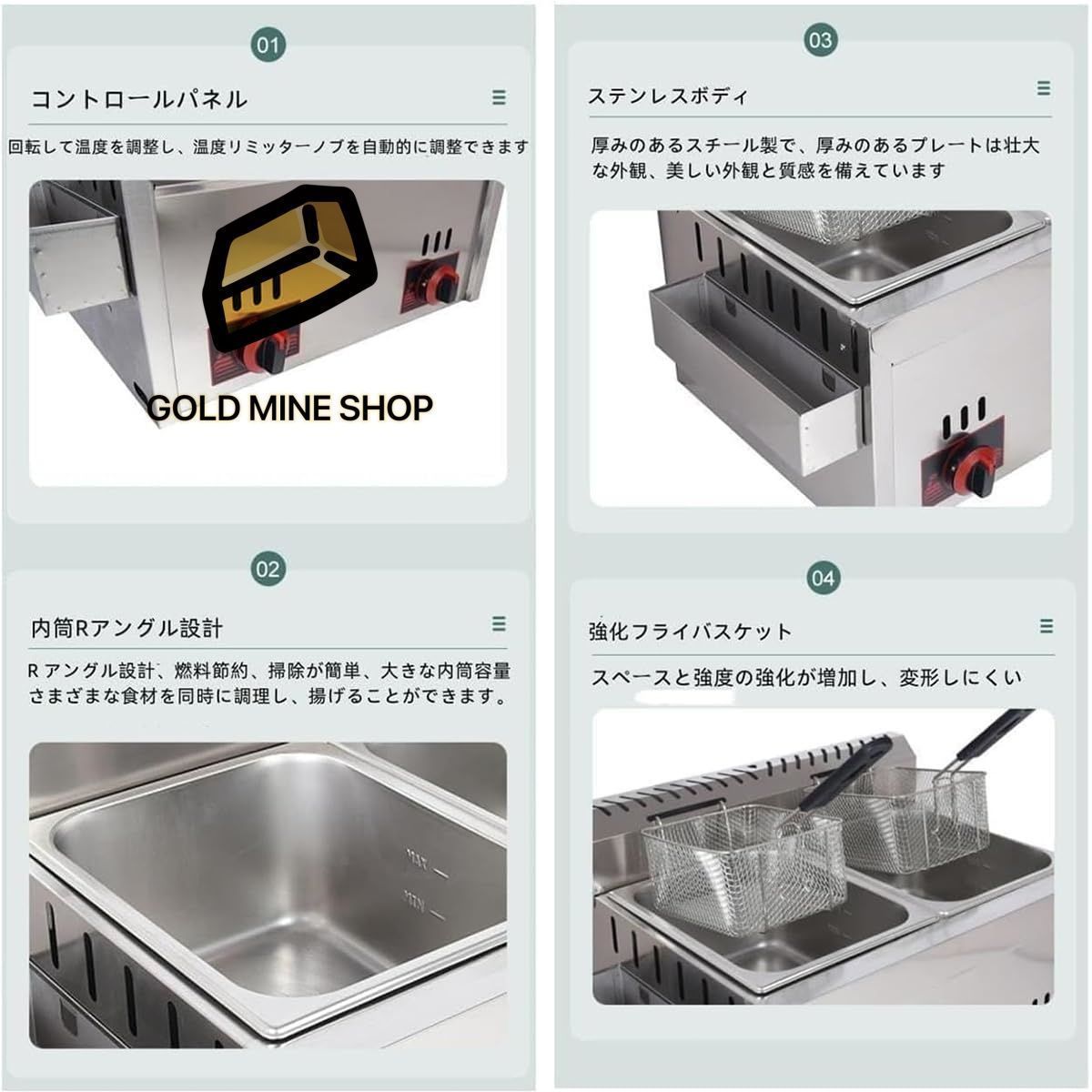 ガスフライヤーは金属製のバーナーを備えており、急速に加熱します。6L+6Lの大容量で、一度に多くの食品を生産できるため、複数の人のニーズに簡単に対応でき、顧客の損失を減らすことができます。フライドチキンレストラン、寿司レストラン、朝食ショップ、ミルクティーショップなどのシーンに適しています。フライドチキン、エビフライ、魚のフライ、オニオンリングのフライ、野菜のフライなどの揚げ物に使用されます。 商品の説明製品説明: 業務用天ぷら鍋を使えば、特別な料理をいつでも完璧に揚げることができます。 大容量で、複数人の食品のニーズを簡単に満たすことができ、一度にたくさんの食品を揚げることができます。 推薦する 天ぷら、揚げパン、魚フライ、パンケーキ、フライドポテト、フライドチキン、フライドチキン、牛乳、玉ねぎ、卵焼き、オムレツ、オムレツ、パンケーキ、コーラなどの揚げ物。 特徴: ツインシリンダー ●スムーズな操作パネル。 軽量・小型・省スペースのガスフライヤー ●フライバスケットが内側からズレにくい設計なので安心して調理ができます。 仕様 商品名:ガスフライヤー 暖房タイプ:LPG 機械サイズ:62.5 * 47 * 40.3cm オイルシリンダーサイズ:29.5 * 23.5 * 14cm フライバスケットサイズ:20.5 * 17.5 * 10cm 容量:6L+6L 材質:ステンレス鋼 バルブ:低圧バルブ 防止 機械はガス低圧バルブを使用する必要があります。 油の爆発や飛沫を防ぐため、加熱するときは蓋を清潔で乾燥した状態に保ってください。