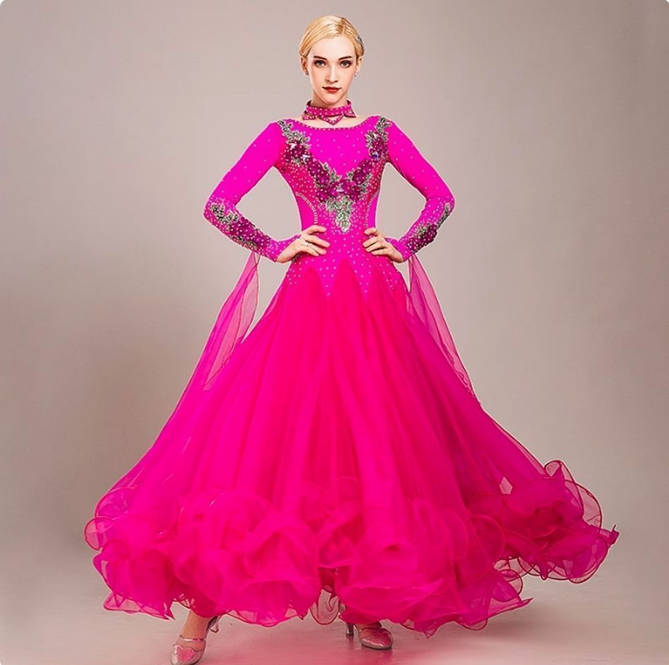 L 社交ダンス ドレス ダンス衣装 ワンピース 刺繍 競技ダンス 赤 ダンスウェア ワルツ ワインレッド モダン 練習着 スタンダード レッスンウェア