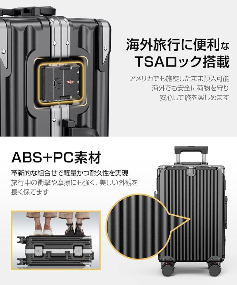 ✅【TSAロック搭載・海外旅行も安心】 スーツケース TSAロックを標準装備しているため、海外旅行でも施錠したまま安心して預けることができます。アメリカ旅行にも対応し、セキュリティ面で優れた保護性能を発揮。海外での移動や出張の際も安心してご利用いただけます。✅【3段階調節ハンドル&360°静音キャスター】 スーツケース の3段階に調節可能なハンドルは、子供から大人までどんな身長の方にもフィットします。 スーツケース 軽量 で頑丈なアルミ製ハンドルは、揺れや衝撃を吸収し、長時間の移動も疲れを感じさせません。また、360°静音キャスターにより、どんな路面でもスムーズに移動でき、騒音を気にせず快適で滑らかな移動が可能です。
