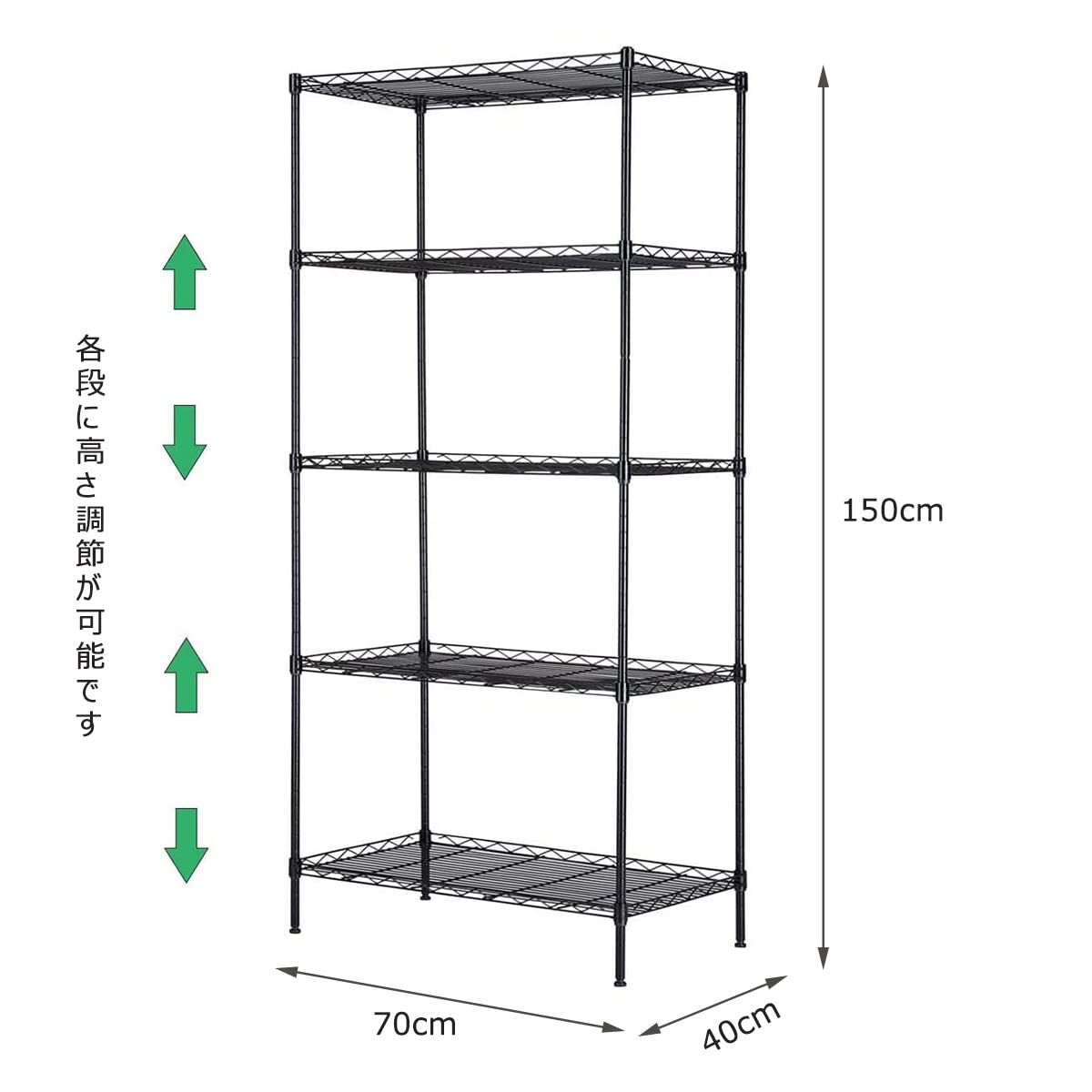 スチールラック メタルラック キッチンラック 本体 高さ調節 5段 防サビ加工 棚 収納 頑丈 キャスター付き ブラック 幅70×奥行40×高さ150cm